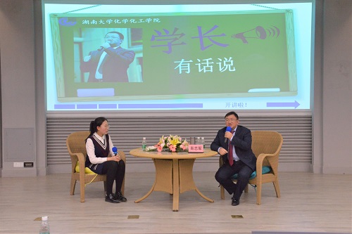 颁奖后,是此次会议最具有意义的一个环节——“学长有话说”,由肖志军先生为在座各位同学传授经验。首先,肖先生是一名企业家,作为企业人,他认为一个企业的成功不在于财富的累积多少,即使登上福布斯排行榜第一名也不是他的愿望。他认为一名企业家的终极成就在于他对于慈善的贡献。同时,肖先生作为96级的湖大校友,也是化工院在座同学的学长,他语重心长地劝诫各位学弟学妹把握自己学习的机会——“家庭的贫穷不是你们的责任,但也不是你们不能成功的借口。”同学们被肖先生精彩的讲话深深吸引和折服,自发鼓起掌来。
