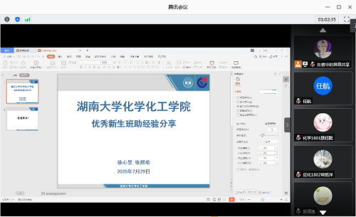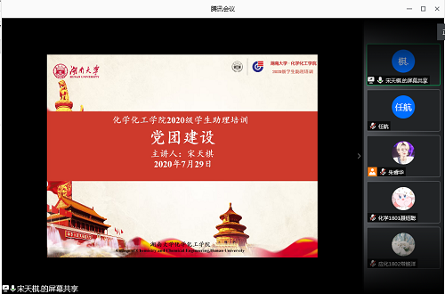 2020年7月29日下午三点,永利集团248cc登录永利集团248cc登录于腾讯会议举行化工院第四场线上学生助理培训以及2019级学生助理的经验分享会。本次培训由化工院本科2020级辅导员宋天棋老师对党团建设进行讲解说明,徐心昱,张煜希同学进行经验分享。