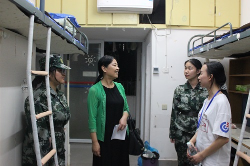 老师们分为三组,分别由新生班助理负责人带队同时走访不同的寝室。张晓兵院长、刘松副书记和其他老师到男生寝室询问同学们在军训期间是否有很好的适应长沙多变的气候,询问他们近几天的生活状况并和同学们谈论军训的感受。在交谈的过程中张院长也给予了同学们一些关于军训和在生活中的建议。