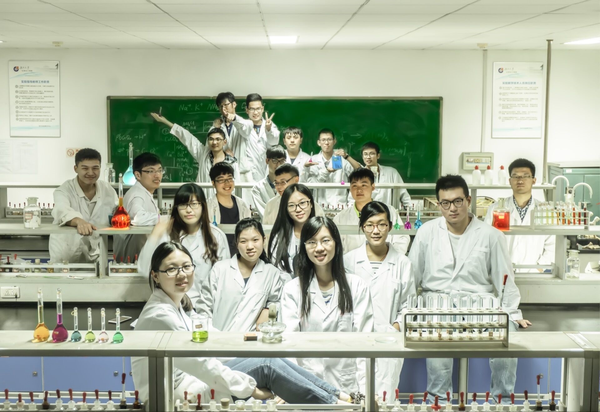 在集合全班同学拍摄之前,班委会们已经向负责管理实验室的无机老师进行了说明,借到了一间实验室作为毕业照的拍摄场地之一。同时,一些同学也向教授分析实验的老师借到了能够配制各种颜色的药剂。