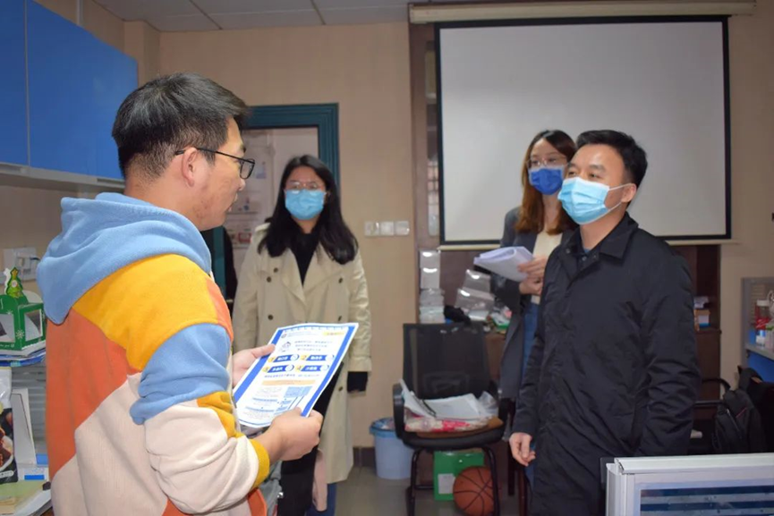 为切实做好新冠疫情防控工作,引导同学们在校期间健康、安全、有序地开展学习生活,3月18日上午,永利集团248cc登录党委副书记潘刚峰老师、学工办主任兼研究生辅导员刘卓老师、研究生辅导员徐晓宇老师、研究生辅导员蒋晓洁老师及研究生会学生干部走访学院部分实验室。