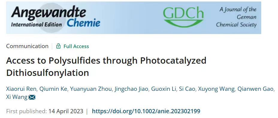 近日,我院王兮教授团队利用光致氧化还原策略实现了多种不饱和烃和张力环烷烃的连二硫磺酰化反应,并发明了一种新型亲核连二硫化试剂,实现了多种亲电试剂的亲核连二硫化反应。这种新试剂可以利用苯乙烯的连二硫磺酰化反应高效制备。相关成果以“Access to Polysulfides through Photocatalyzed Dithiosulfonylation”为题发表在国际高水平期刊德国应用化学《Angewandte Chemie International Edition》上。
