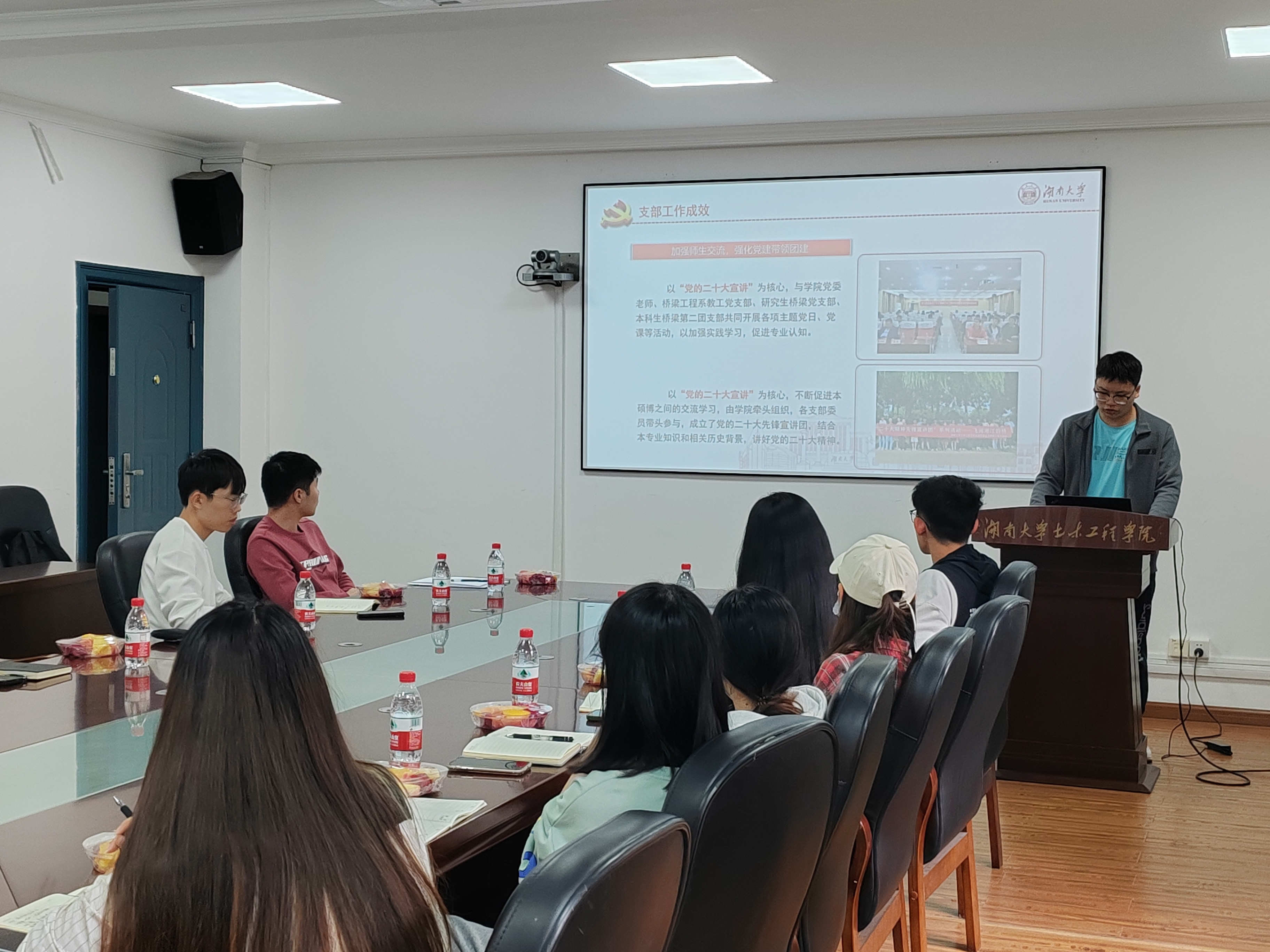其次,土木工程学院2022级硕士桥隧党支部从支部建设情况、已经获得的部分成果以及支部目前面临的问题等方面进行了分享。