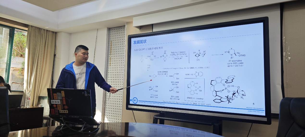 在报告环节,16位同学依次进行了精彩的汇报,内容涵盖有机合成与生物合成、生物探针与分析、抗感染、抗癌与抗精神性疾病等研究方向。同学们从研究背景、核心内容、最新进展和未来方向等方面进行汇报,展示了他们在各自领域的研究成果和创新思路。各位老师也与同学们进行了深入交流,并就科研过程中的细节,如思路凝练、实验设计、数据处理和演讲技巧等,给予了具体而实用的建议。