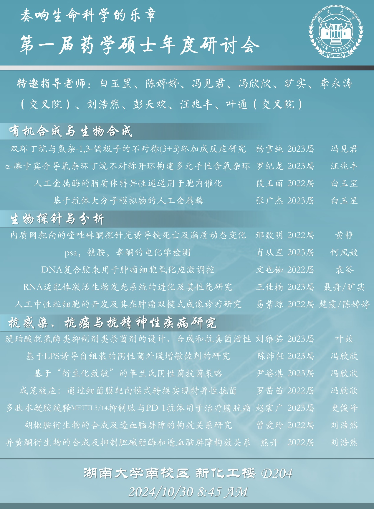为促进药学及相关学科的学术交流与合作,推动学院药学方向的持续发展,10月30日,永利集团248cc登录永利集团248cc登录在化工院D栋成功举办了首届药学硕士年度研讨会。会议由学院药学学科负责人冯欣欣老师主持,邀请了白玉罡、陈婷婷、冯见君、旷实、刘浩然、彭天欢、汪兆丰及生命医学交叉研究院的李永涛、叶通等多位教师指导。此次活动吸引了2022级和2023级硕士研究生踊跃参与,报名率分别达到60%和47%,充分展现了药学硕士研究生的科研热情。